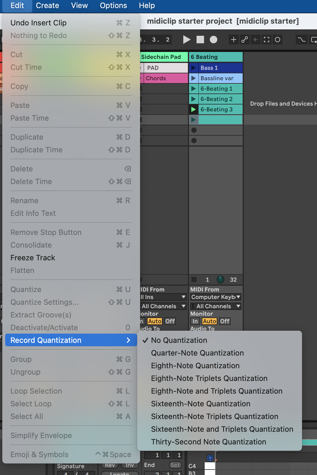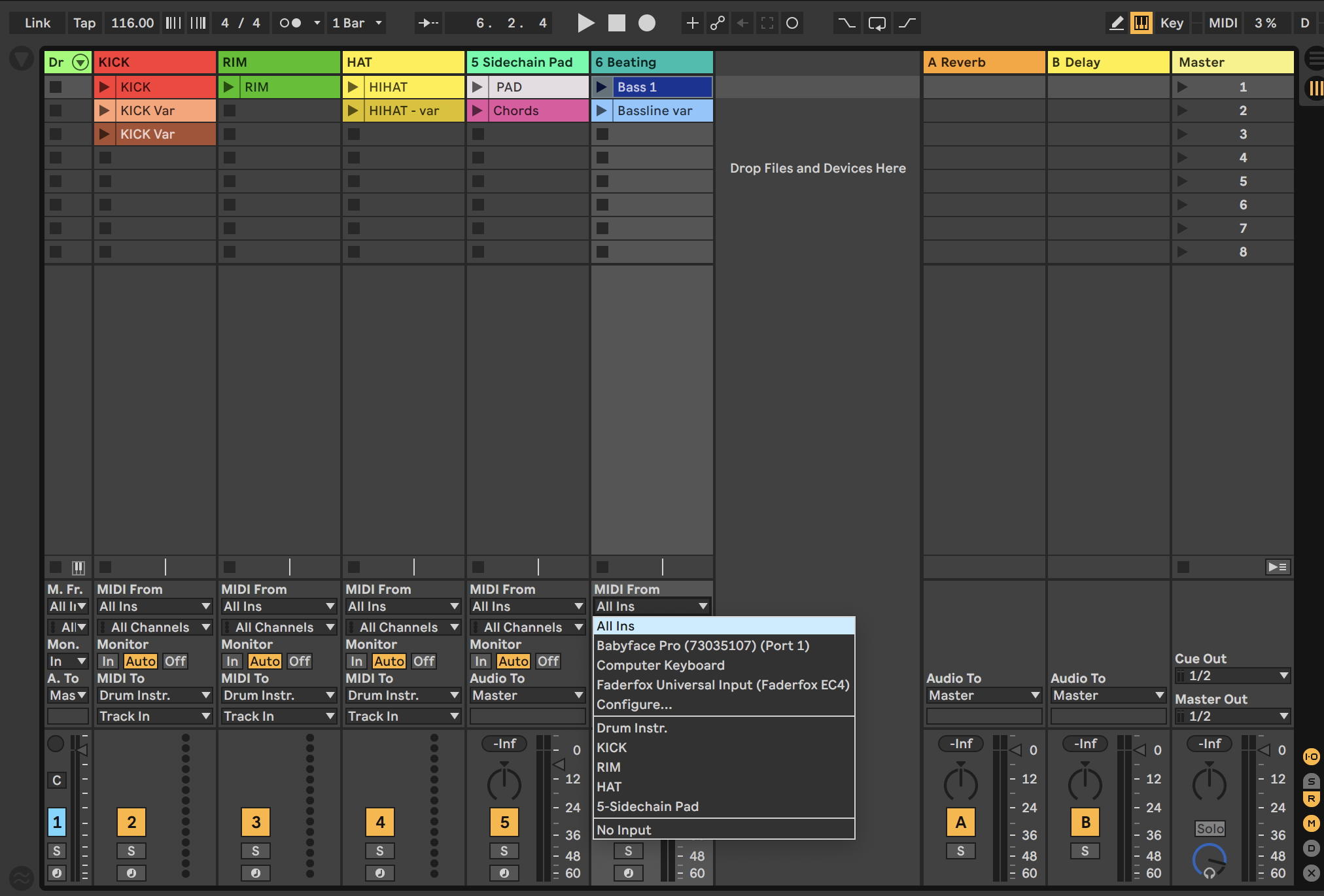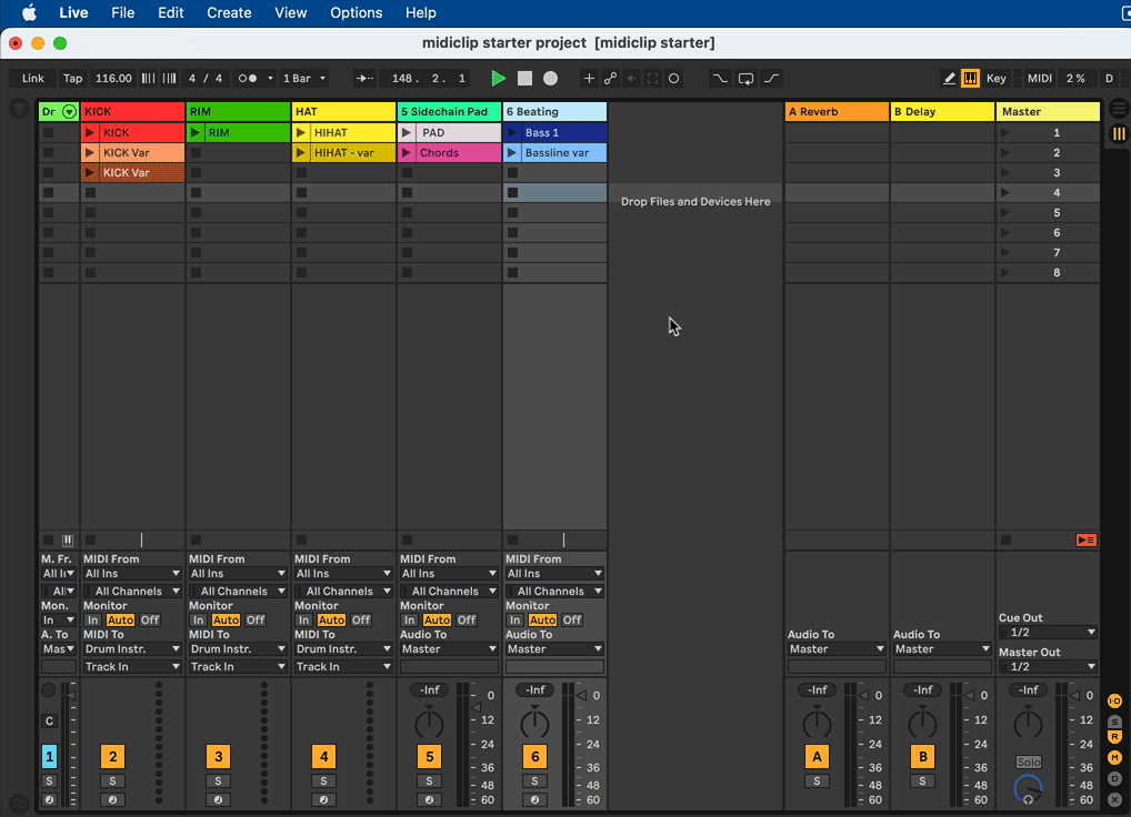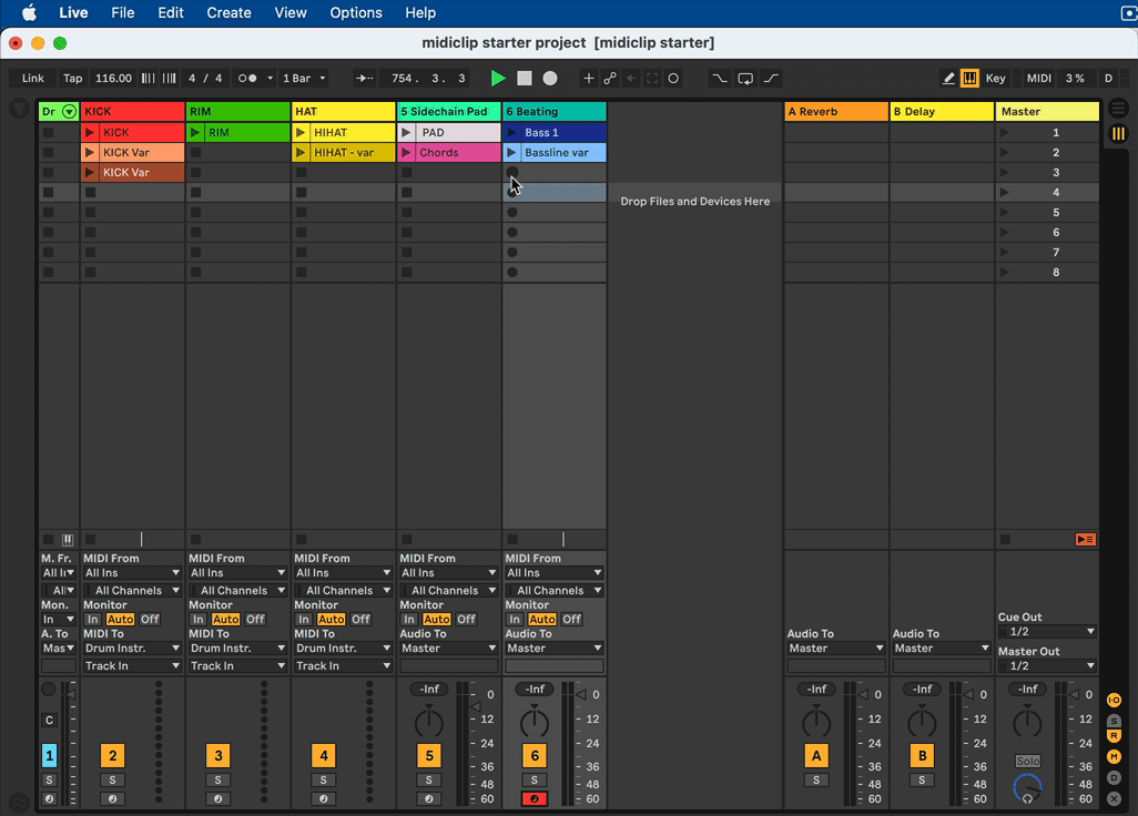 We will illustrate the process of recording midi clips in the session view (ableton calls this recording into session slots).
