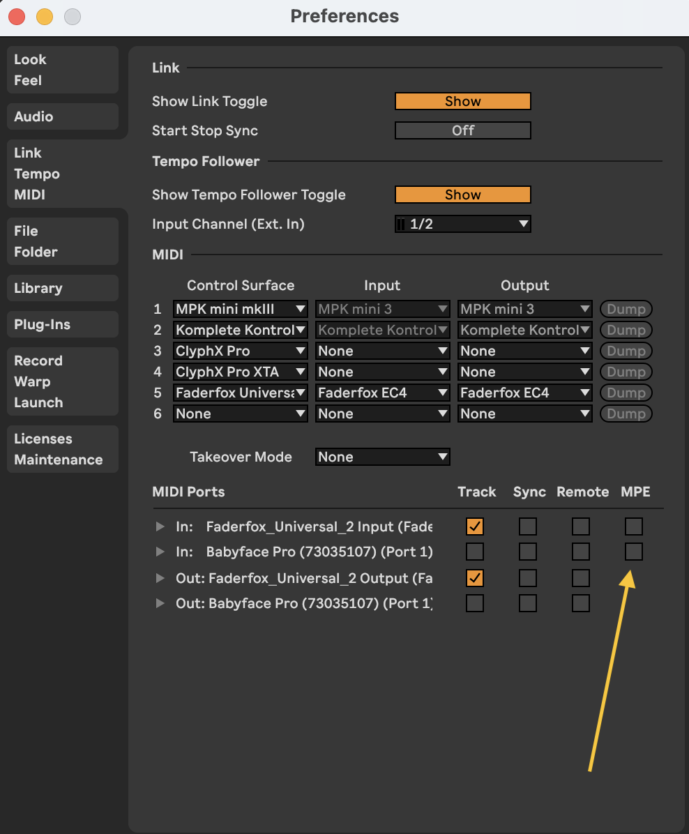 Use Live/Preferences then link tempo midi to activate the MPE for a compatible keyboard: